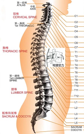 人体的脊柱依部位可分为五类:颈脊( cervical spine )七椎、胸脊( thoracic spine )十二椎、腰脊 ( lumbar spine )五椎、骶骨( sacrum )五椎融铸成一、尾骶骨( coccyx )三或四椎融铸成一。整条脊柱由脊椎骨相迭而成、自然迭成 S 形曲线,能均衡承担重量。两脊椎骨之间有骨盘与韧带;弓背弯腰时,前面的骨盘与韧带压缩,后面的拉长,重量不均的负担( load )使脊椎骨受到极大的压力( stress )。从立姿开始弓背弯腰达到双手著地,动作愈慢,时间拖得愈长,对骨盘与韧带的杀伤力也愈强。