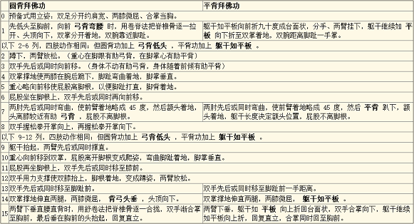 拜佛功一招包括许多动作。为节省篇幅,下面分解表中,每列都超过一个动作