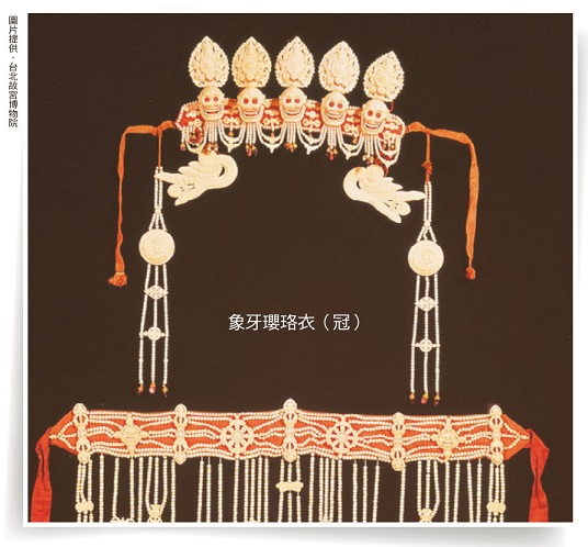 这一顶被称作“象牙璎珞衣(冠)”,是清朝(1644-1911年)乾隆时期从西藏来的文物,头冠以外的饰物本文就不作讨论了;重点是头冠的主体,仍旧是五个髑髅头,当然应该称为“五方鬼冠”,这代表著喇嘛教在进行与所谓的“祈福”相关的种种法会,或者是唱诵呼召鬼神的咒语,因感应而从各方聚集前来参与仪式的各类鬼神,当然不应该称为“五方佛冠”。