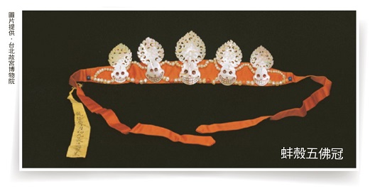 在该网页的说明中,表示此“蚌壳五佛冠”乃是清朝时期,约西元1644~1911年(约乾隆58年之后)的文物,以珠母贝壳刻制而成,每片叶瓣都雕刻为髑髅头顶著火焰,而且还毁谤佛陀说那是佛的忿怒像。五片髑髅造型帽叶缝在红布系带上,并装饰著珍珠、珊瑚珠、青金石珠于其间,系带一端墨书经咒文字。
