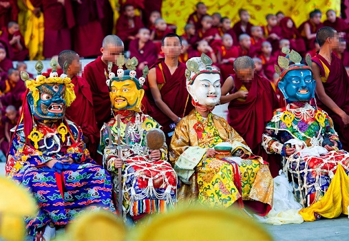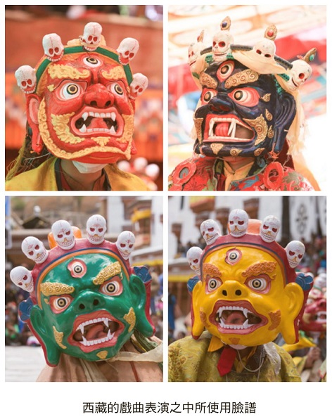 喇嘛教的本质及其所修学的种种法,实际上完全都没有佛法的内涵,而当他们的邪见、邪说被善知识所摧破之后,又无法矢口否认,所以就改用其他的事相来欺瞒、笼罩众生。现在他们就把“金刚舞”搬上萤幕,在网路上放送高清(HD)的画面,宣称要是能有机会看见某一个上师、法王,亲自跳金刚舞的话,那是要有很大的善根与福报才会有因缘的。然而,“金刚”是什么?不就已经在他们的身相,以及其所顶戴著的“五方鬼冠”上面显示出来了吗?这样子一来,就不用笔者多费唇舌来说明,为什么“喇嘛教的本质就是跟诸方鬼神打交道的宗教”,以及为什么五方佛冠的本质,其实就是“五方鬼冠”的原因了。因为从这一些恐怖狰狞自曝其短的影像显示,他们自己就已经把这个事实公诸于世了。于是,为了想从众生这里获得利养,所以就“改头换面”迎合众生的喜好,盗用世尊三十二大人相福德的名称,把“五方鬼”化妆文饰而演变成“五方佛”;众生感于世尊大慈大悲之福德威德的缘故,凡是见闻佛字音声即心生欢喜,因此也连带喜欢所谓“五方佛”的表相,也就不知不觉地掉入他们的圈套之中,他们就可以用笼罩的手法,对众生予取予求了。如若读者心中还是存疑而不相信,我们从现在西藏的戏曲表演中所使用的面具脸谱,同样也可以了解及证明,并确定这一个事实。