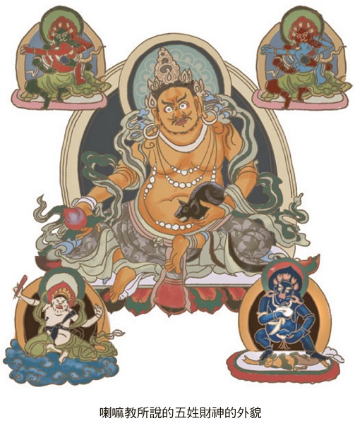 前面曾提到,除了驱遣鬼神行使诛法以外,他们也会驱遣鬼神来谋取他人的财物。我们现在就来看看喇嘛教所说的五姓财神的外貌。