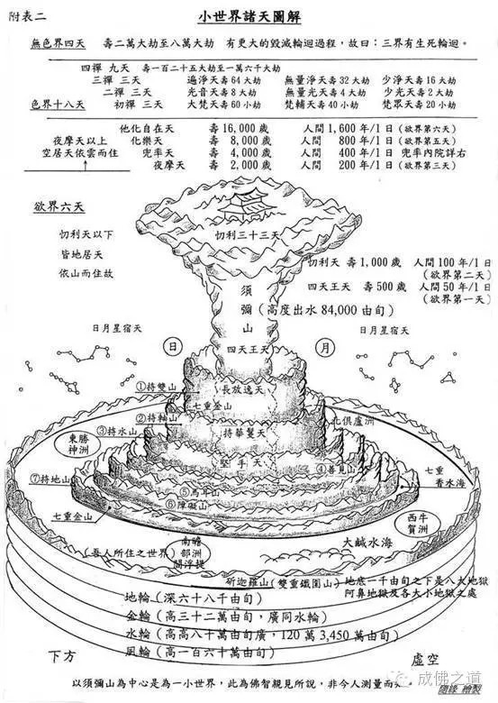 每一个小世界主要都有一座须弥山,而且以须弥山为中心,还有一个太阳、一个月亮;这个太阳、月亮,都只有在这一座须弥山的山腰的位置上面不断的绕行。那须弥山本身它有一半是泡在水中,它在水下大约是八万四千由旬,这个是从佛经上面引出来的。八万四千由旬呢,到底一个由旬是多长多深呢?因为印度的长度或者深度呢,它并不像后来说用公里或者里这样来算,所以后面的研究者就去推测,一个由旬到底代表了几公里呢?推测的结果呢,后来大概有各种说法,大概从四公里到十公里都有,但是也没有一个定论。那我们就用由旬来说,说须弥山本身有一半泡在水中,在水下大约八万四千由旬,露出水面的部分大概也是八万四千由旬;也就是说它有八万四千由旬这样的高度,因为另外一半是在水下。