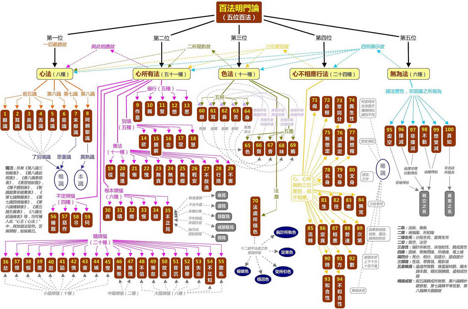 得(由贪心起;)命根(生命);众同分(同类);异生性(类同报异);无想定(外道外执未破);灭尽定(外道法执未破);无想报(生第四禅非想非非想处天);名身(名显用);句身(句显法);文身(字显体);生(成);住(住);老(坏);无常(空);流转(轮回);定异(因果定理与报之差别);相应(相应于定异之间);势速(迁变不停);次第(法之次第);时(时间性);方(方位性);数(数目性);和合性(二乘执着于因缘和合);不和合性(外道执着于自然)