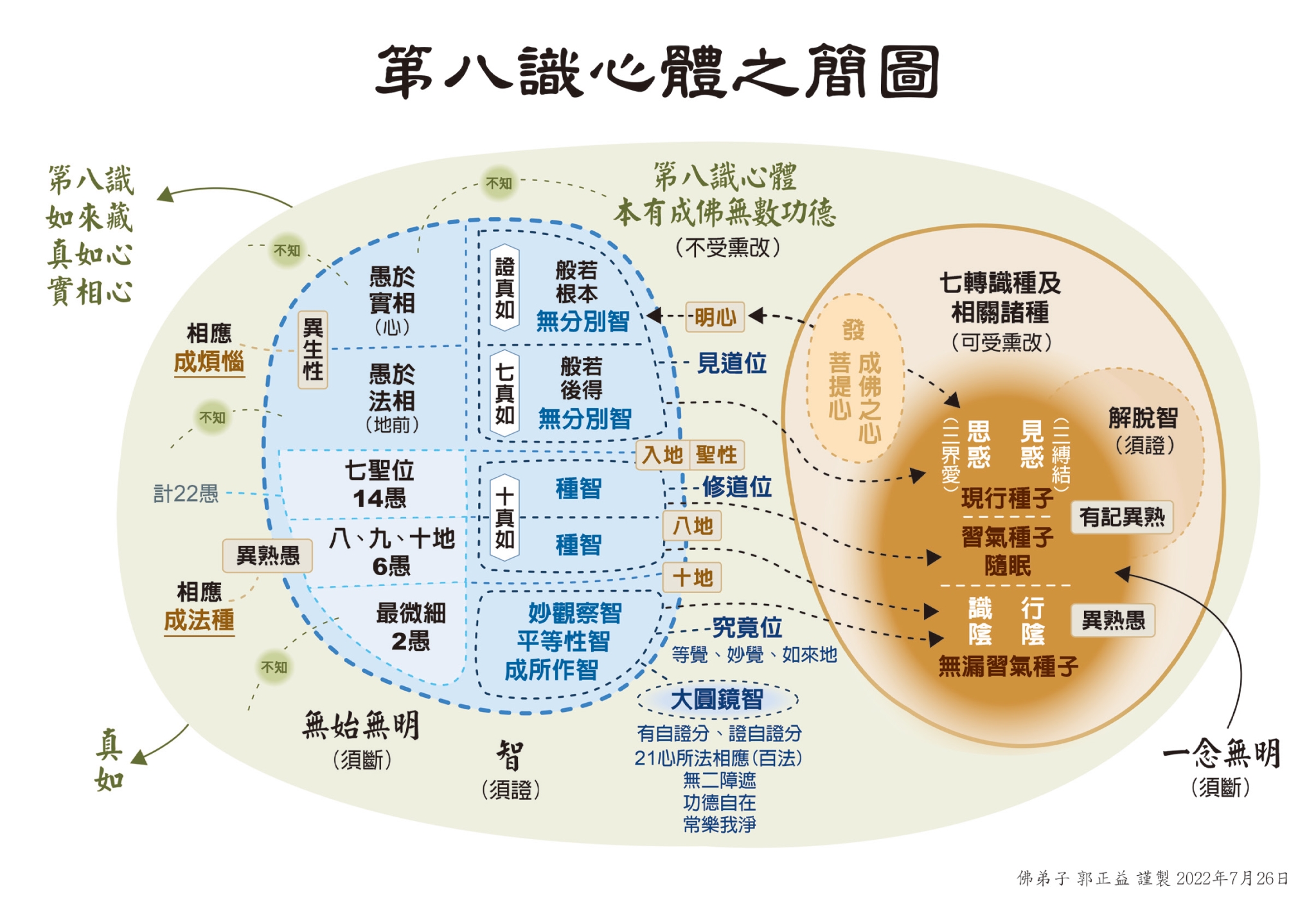 第八识即众生有情的实相心、真如心,又名如来藏。然众生无始来无明笼罩,随业生死流转,不知此心;实则一切有情的如来藏本自具足如来智慧德相,然须断尽二障方能具足显发,如《大乘本生心地观经》卷3云:“众生本有菩提种,悉在赖耶藏识中;若遇善友发大心,三种炼磨修妙行;永断烦恼所知障,证得如来常住身。”[《大正藏》册3,页305,上13-15。]当学人初发大菩提心(成佛心),佛菩提芽种方预其中,菩萨性本无今有,系由第八识如来藏受熏习而成就,故以虚线表示。学人经由亲近善知识,次第闻思修证—于满足十信位后,再历经资粮位、加行位,断除三缚结而具足四不坏信(四不坏净),然后参究真心所在,于因缘成熟时,以一念相应慧内自证这第八识,转依成功而入见道位,现观第八识自性清净无为、真实性、如如性,证知第八识即真如心体、第八识自性即真如性,学人因此发起根本无分别智,不再愚于生死、实相之理,得破一分无始无明,故以虚线表示之。