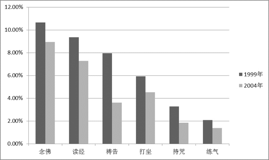 来看看这一张表:根据中央研究院社会所,从1999年到2004年的调查研究,台湾地区的佛教徒、佛弟子们平常所采用的修行法门,一直都是以念佛为最主要的,其次才是读经、诵经、打坐等等。研究报告中也指出,台湾宗教的发展方向,是从民间信仰这一类比较缺乏具体宗教认同、没有明确目标的这一个信仰,转成了有组织、有形的宗教的方向发展。这就意味着说,台湾的学佛人,大部分都是心性纯厚的念佛行者。