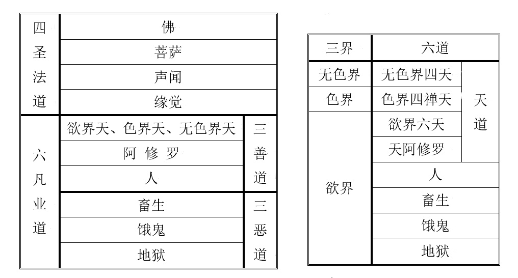 那么这边,我们还要再说明,就是说宗教信仰当中的神祇,像神道教的神祇,或者是说像一神教的教主、天主,他们的地位到底是什么?我们要以佛教的十法界,来判定他们的地位是什么。佛教当中说一切的众生,依着他们过去所造作的善恶还有净业,然后就会受报到各个不同的界,这个法界,所以有所谓的十法界的区分。那这个十法界,讲的就是四圣法道----就是佛、菩萨、声闻、缘觉这四圣法道,还有天、人、阿修罗、畜生、饿鬼以及地狱众生的这六凡业道,合起来总共是十法界。那其中的六凡业道呢,依照佛经上的说明,说因为每一个业道,他生活环境的不同,也就是说他的生活环境有的是清净、有的是污秽。好比说我们现下可以看得到的,一般来讲人的生活环境是比动物的生活环境要清净,那么人的生活环境也是比一般的这些动物、畜生道的这些有情它们的生活环境要富足。那么由这样子清净以及污秽的不同,还有富足跟贫乏的不同,所以这个六凡业道对众生就会有不同的效益,也就是说你出生在六凡业道当中,你所能够感受的那个效益那当然就不一样,所以说六凡业道它会有那个价值的高低不同。所以刚刚所讲的人的这个法界,它的价值当然是比畜生道这些有情的法界它的价值要高,所以说佛法上就有所谓的“三善道”跟“三恶道”----三善道就是天、阿修罗还有人,三恶道就是畜生、饿鬼、还有地狱的众生。这个也就是一般人所熟悉的,说如果这个人他能够行善,能够持五戒,就能够得人身;如果是加修十善的话,就能够生到欲界天,成为欲界天人;乃至于他更进一步,如果去修学禅定,有了禅定的功夫,依着禅定功夫的深浅不同,就会生到色界或者是无色界天当中,在这些法界当中去享受种种可爱的乐果。反过来说,如果造作了偷盗、诈欺、杀人越货,乃至谤佛、谤法的恶业,那就依着他所造恶业的轻重,会受报到畜生、饿鬼、地狱三恶道当中去受种种的苦。那么这六凡业道当中的天道,是分属于欲界天、色界天还有无色界天,那么其余的人、畜生、饿鬼、地狱这四个法道,那就是在欲界天之下的欲界。那阿修罗呢?他是遍在天、人、畜生、饿鬼、还有地狱这五道当中。那么和刚刚所说的欲界天、色界天、无色界天,就成为三界,还有天、人、阿修罗、畜生、饿鬼、地狱,这六种业道,那么三界跟六道合起来,就是三界六道。