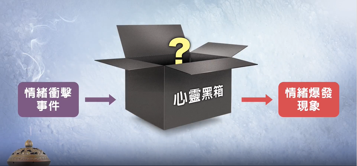 我们来看图一,图一所显示的是:我们每天生活中都有很多事件,这些事件都有可能成为冲击我们情绪的事件,这里把它称为“情绪冲击事件”,这些情绪冲击事件进入到我们的内心,因为每个人内心运作结果不同,就有各种不同情绪现象产生;但是对于每个人的内心到底是怎么作业、怎么运作的,通常我们搞不清楚自己内心,也搞不懂别人内心是怎么一回事,所以这里我把它叫作“心灵黑箱”。